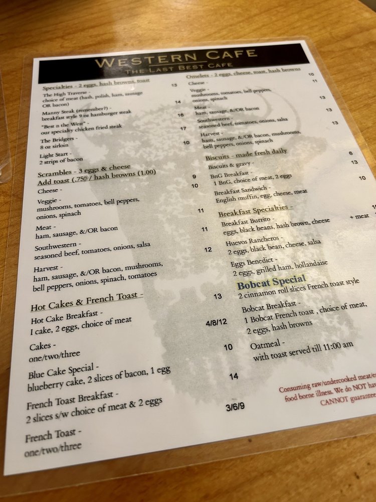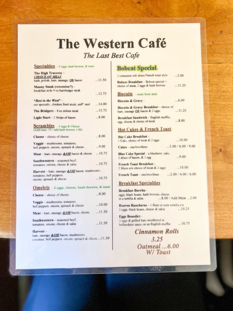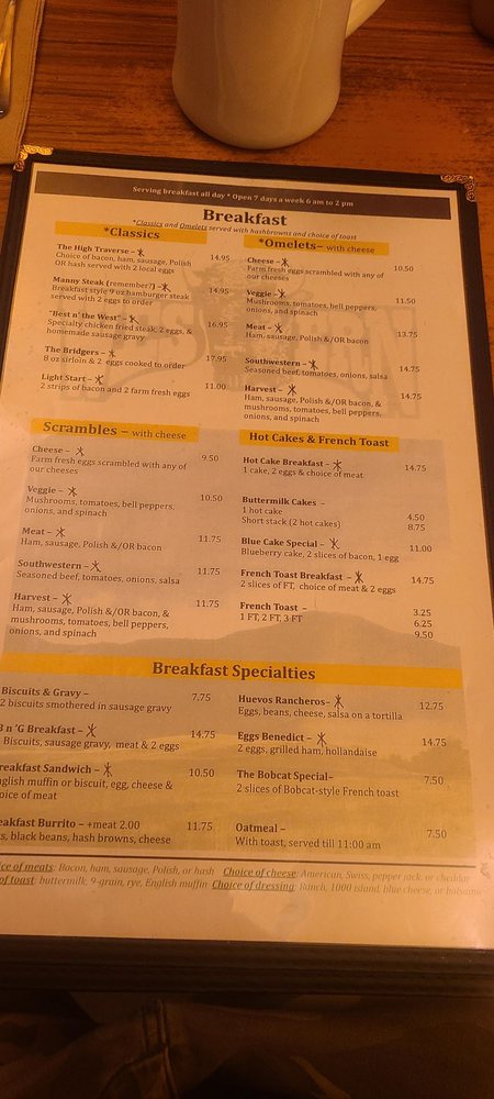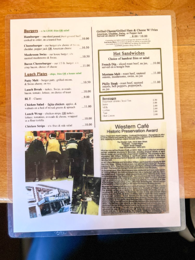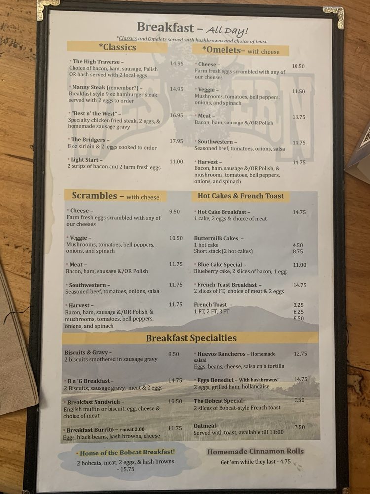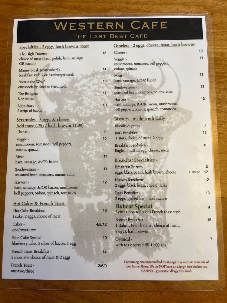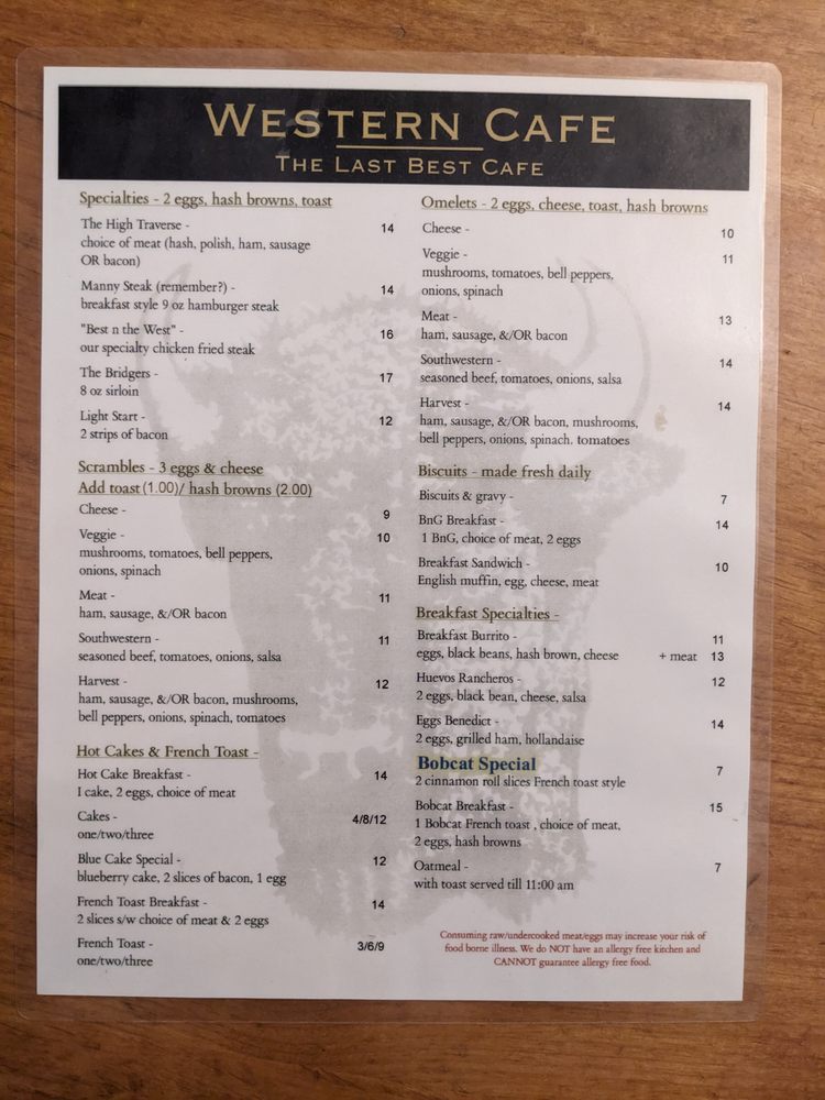 Introducing the menu at Western Cafe, a delightful breakfast and brunch spot in Bozeman, MT. With a variety of options such as the Lunch Wrap with fajita chicken or Turkey, Fish & Chips, Southwestern Omelette, Veggie Omelette, Cheese Scramble, and Harvest Scramble, there is something for everyone to enjoy. The casual ambiance, outdoor seating, and dog-friendly policy make it a great spot for groups, kids, or even a solo visit. The menu offers vegan and limited vegetarian options, with happy hour specials, alcohol, and catering services available. The use of reusable tableware shows the commitment to sustainability. Don't miss out on the flavorful dishes at Western Cafe, where every bite is a taste of perfection.